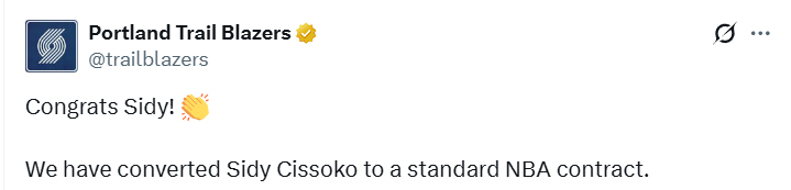 北京时间2月21日,波特兰开拓者官方宣布,将西索科的双向合同转为正式NBA合同,他由此进入球队15人常规赛大名单。据联盟消息人士透露,开拓者和西索科签约两年,这份合同将持续至2026‑27赛季。为给这位21岁前锋腾出名额,开拓者裁掉了吕佩尔。