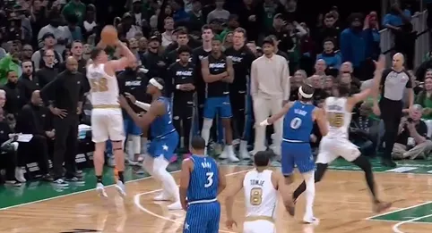 比赛第四节,加尔扎接球后直接三分命中,凯尔特人战胜魔术。